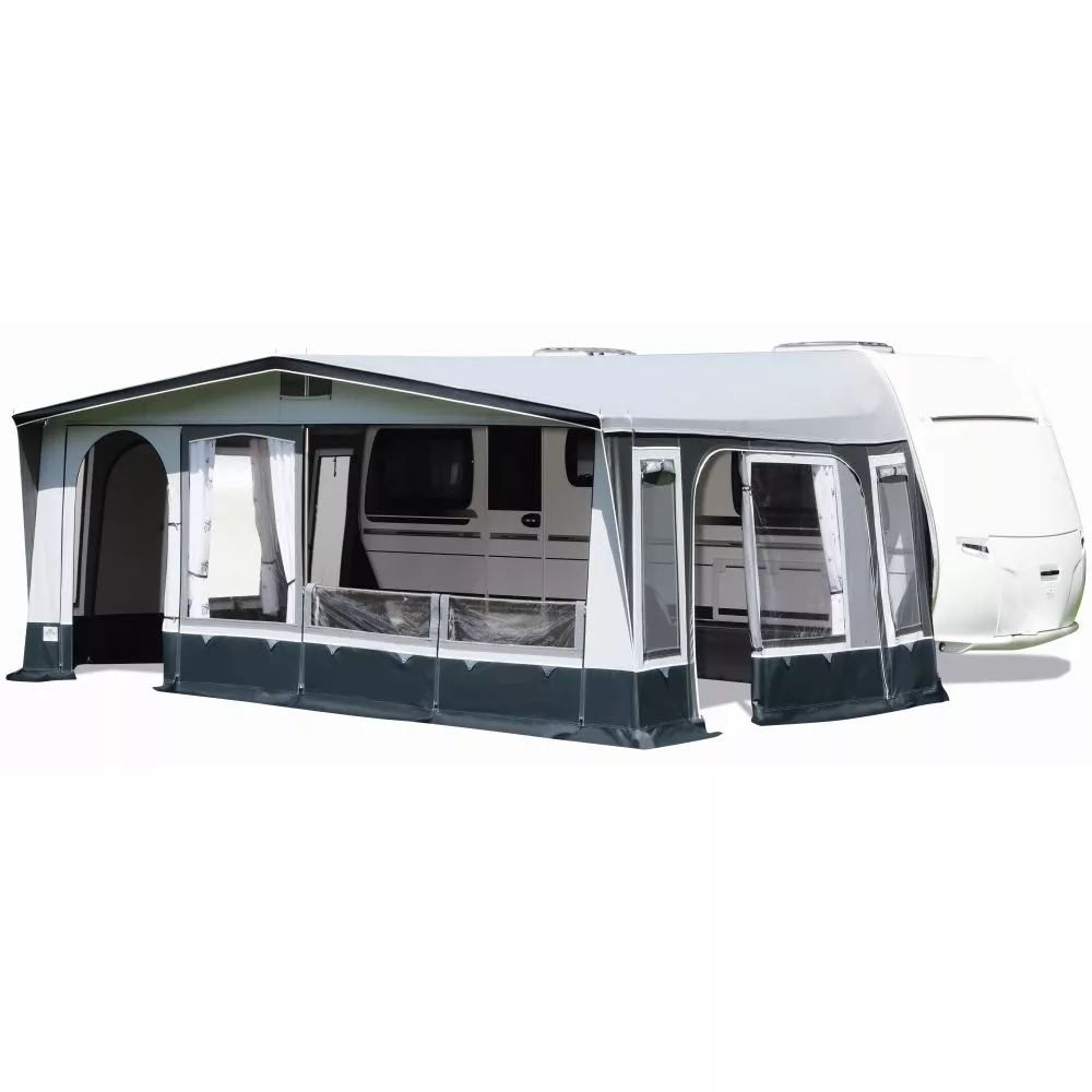 Dieses Caravanvorzelt ist bei Bedarf optional mit einem Vorzelt-Sonnendach erweiterbar. Damit schaffst du dir einen Schattenplatz und kannst deine Sitzgruppe ins Freie verlagern. Oder du benötigst weitere Schlafplätze oder Stauraum? Dann ist der als Zubehör erhältliche Erker bzw. Seitenanbau die Lösung.